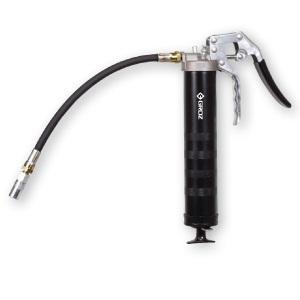 Mazací lis jednoručný pre 400g kartuše aj na plnenie plničkou lisov, kapacita 500cm3, plniaci a odvzdušňovací ventil, 300 mm flexibilná hadica, koncovka so 4 čeľusťami a poistnou guličkou, závity M10x1. • Jeden z najobľúbenejších mazacích lisov z dôvodov ľahké manipulácia a vynikajúcu použiteľnosť v obmedzenom priestore • Pevná hliníková hlava prechádza v silnej pištoľové uchytenie • Pištoľové uchytenie je navrhnuté tak, aby pri manipulácii nedošlo k priškripnutiu prstov • Vytvára tlak 5000 PSI / 345 BAR • Robustný valec o hrúbke steny 1,2 mm osadený valcovaným závitom pre ľahkú manipuláciu pri plnení • Kompletný lis je možné rozšíriť o pevú rúrku o dĺžke 100 mm zakončenú mazacou štvor-čeľusťovou koncovkou